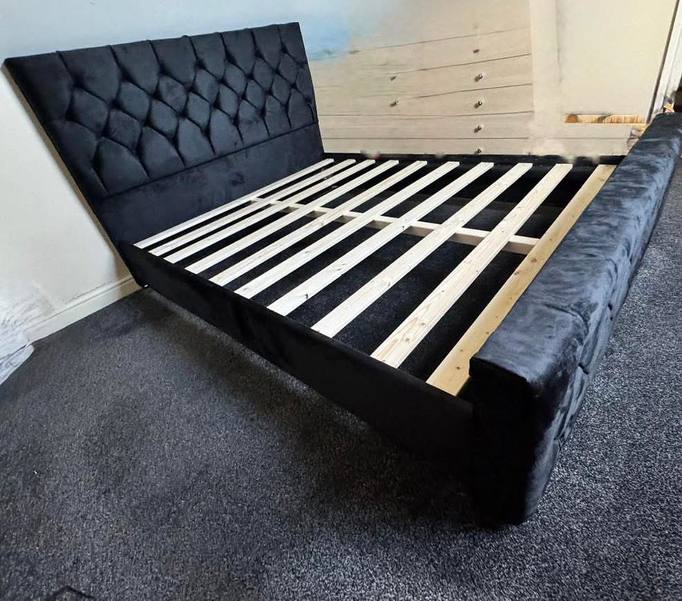 MADE TO ORDER BED FRAMES ALL COME WITH TIMBER SLATS AND CHROME FEET - ALL FABRICS/COLOURS CAN BE CHANGED - DIAMANTE OR COVERED BUTTONS AVAILABLE
