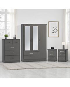 Trio set containing - Two door wardrobe, 4 Drawer Chest & bedside. This is an ideal solution for those looking for a new bedroom set that will match any existing furniture.