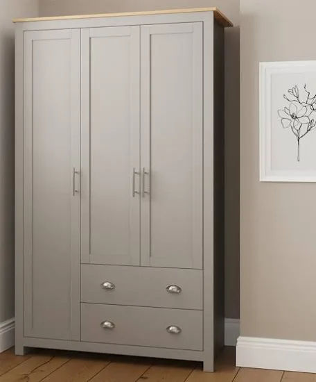 Our stunning Lancaster bedroom furniture range will bring a stylish look to any home contemporary, or traditional. Designed with clean edges and available in a modern soft grey or cream finish with contrasting oak veneer top – the Lancaster range is a modern, practical, affordable furniture range and with stylish satin silver handles and knobs looks fantastic too.